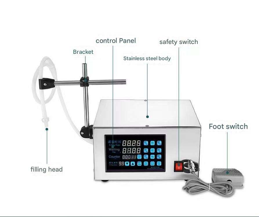 เครื่องบรรจุของเหลวแบบกึ่งอัตโนมัติชนิดปั๊มแม่เหล็ก 1 หัวฉีด สำหรับเครื่องดื่ม น้ำผลไม้ น้ำมันหอมระเหย เหล้า น้ำยาบ้วนปาก นม เครื่องปรุงรส เครื่องสำอาง
