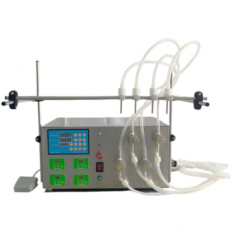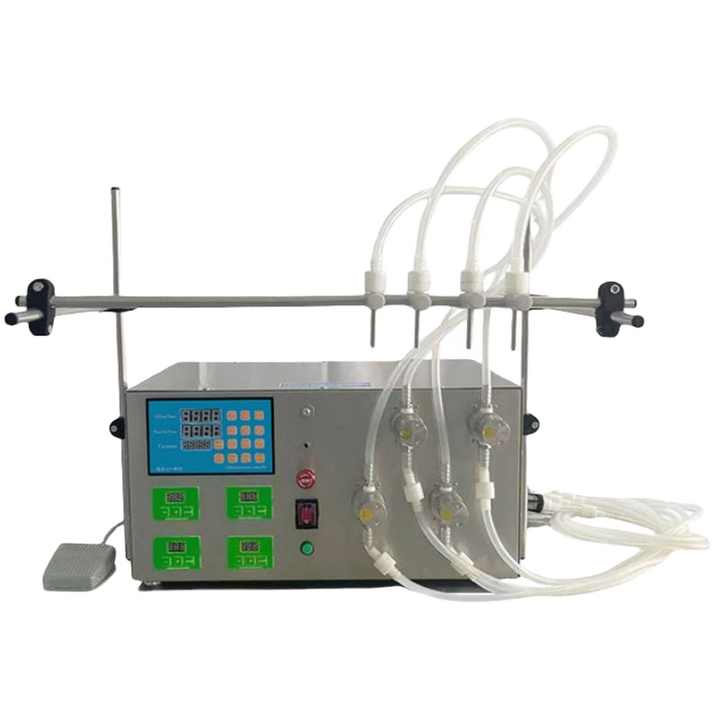 เครื่องบรรจุของเหลวแบบกึ่งอัตโนมัติชนิดปั๊มแม่เหล็ก 4 หัวฉีด สำหรับเครื่องดื่ม น้ำผลไม้ น้ำมันหอมระเหย เหล้า น้ำยาบ้วนปาก นม เครื่องปรุงรส เครื่องสำอาง