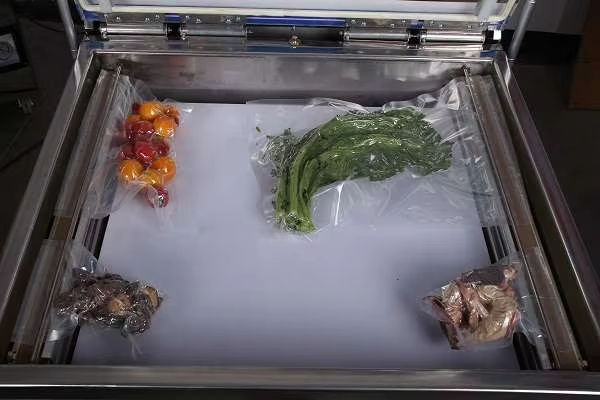 เครื่องบรรจุภัณฑ์สูญญากาศแบบกึ่งอัตโนมัติขนาดเล็กสำหรับอุตสาหกรรมคุณภาพสูงแบบสองห้องแนวตั้งที่ดีที่สุดสำหรับอาหารทะเลและผัก