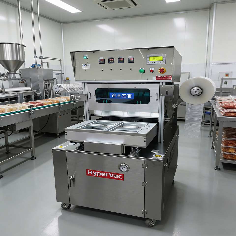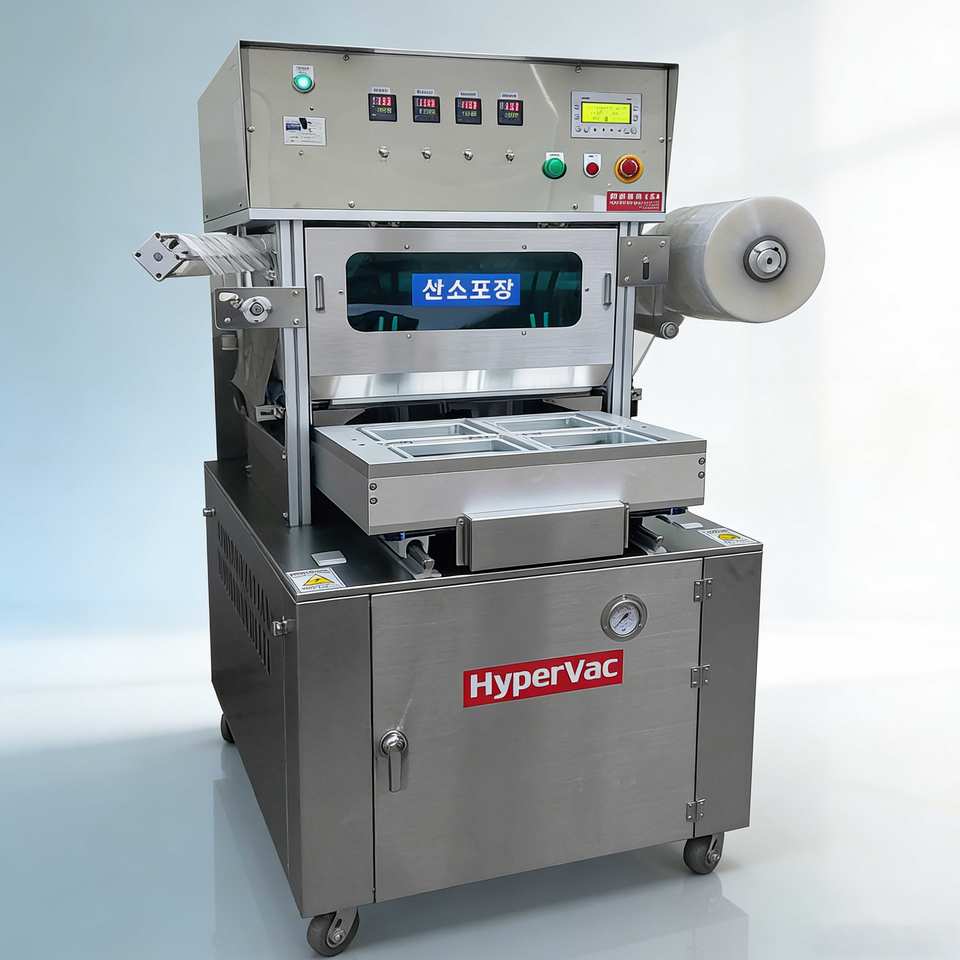 เครื่องซีลถาดกึ่งอัตโนมัติ ระบบเติมแก๊ส MAP สำหรับบรรจุภัณฑ์บรรยากาศดัดแปลง สำหรับผลิตภัณฑ์สด เนื้อสัตว์ วัสดุ SUS304 ยี่ห้อ HYPERVAC รับน้ำหนักได้ 150 กก.