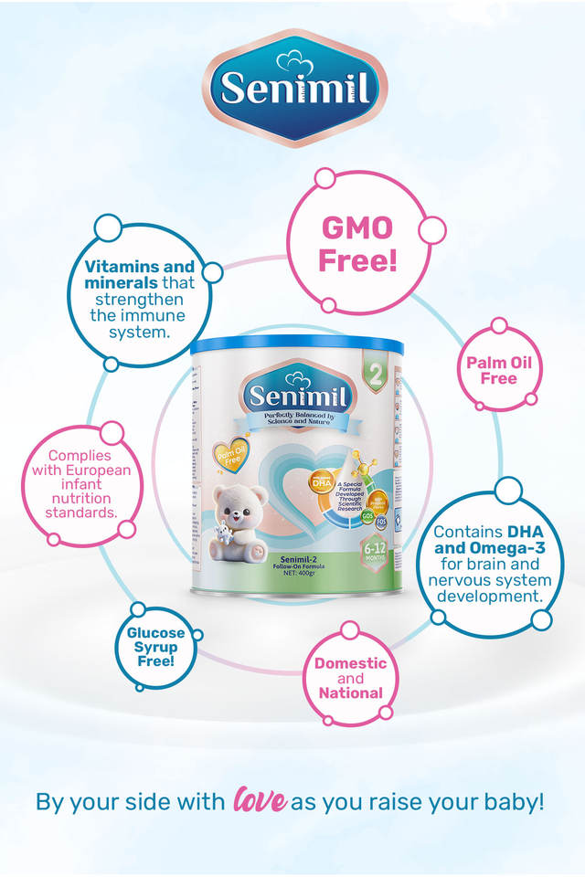 นมผงเซนิมิล 2 พรีเมียม สูตรต่อเนื่อง แบบผง 400 กรัม บรรจุกระป๋องโลหะ ปราศจากน้ำมันปาล์ม เสริมด้วย DHA และ GOS สำหรับเด็กอายุ 6-12 เดือน ปราศจาก GMO
