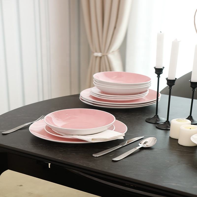 โปรโมชั่นเดือนกันยายน ชุดอาหารเซรามิกสไตล์นอร์ดิกสีชมพูเคลือบใต้ผิวแบบสร้างสรรค์ ชุดอาหารหินสำหรับรับประทานอาหารค่ำ