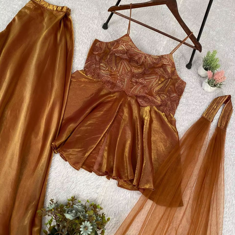 ชุดปักลายดอกไม้แบบสามชิ้น เสื้อท่อนบนทรงปาลาซโซ ผ้าคลุมไหล่ผ้าตาข่ายลายผีเสื้อ สำหรับผู้หญิง สวมใส่ในงานเทศกาล