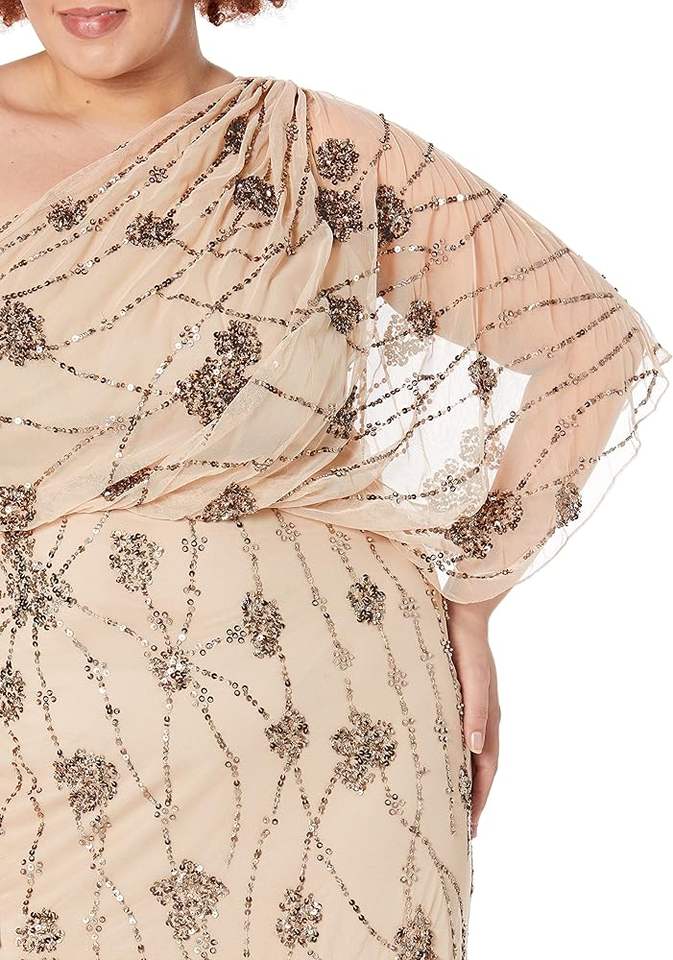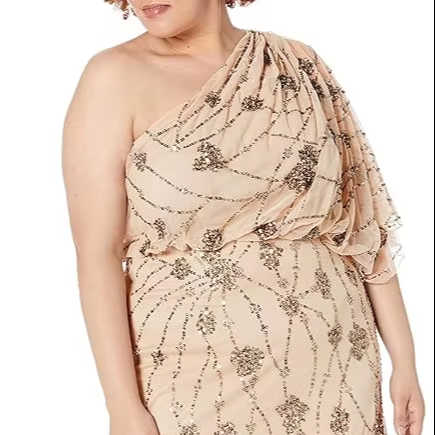 ชุดราตรีแขนเดียวประดับด้วยลูกปัดเลื่อมตาข่ายโพลีความยาวเต็มตัวเดรสค็อกเทลลำลองสำหรับงานปาร์ตี้