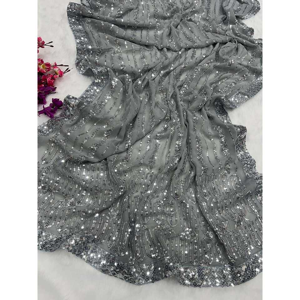 ชุดส่าหรีมีขอบลูกไม้ปักเลื่อมสำหรับงานปาร์ตี้ชุดราตรีปักเลื่อม