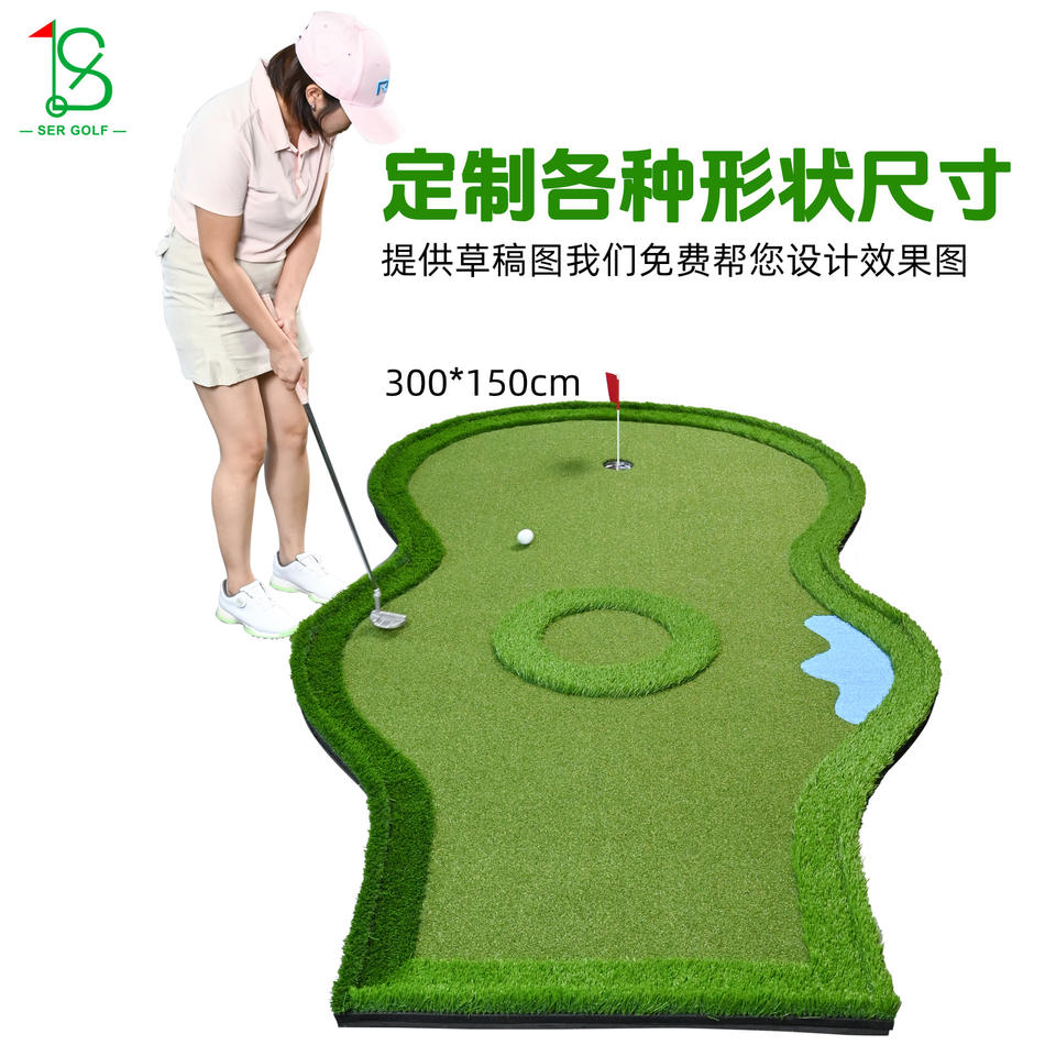 แผ่นหญ้าเทียมสำหรับฝึกซ้อมกอล์ฟในร่ม Ser Golf แบบ 9 หลุม พร้อมธงสีแดงและดีไซน์พื้นที่อันตรายจากน้ำ