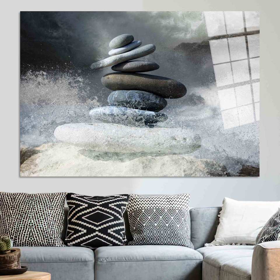 ภาพพิมพ์บนผ้าใบลายหินซ้อนกัน พร้อมหินและน้ำ ศิลปะบนกระจกนิรภัย