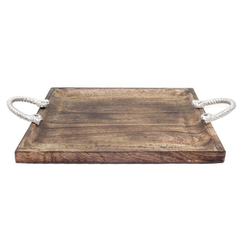 ถาดเสิร์ฟไม้หรูหรารูปทรงสี่เหลี่ยมพร้อมด้ามจับจานและจานชุบนิกเกิลสำหรับร้านอาหารจำนวนมาก