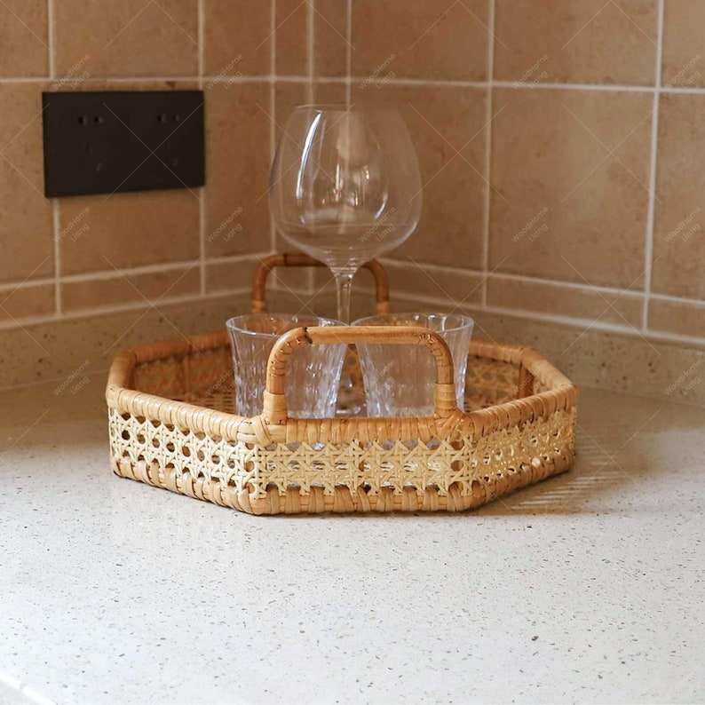 ถาดรองเสิร์ฟผลไม้ถาดรองหวายพร้อมมือจับแบบกลมสำหรับปิกนิกของเรา