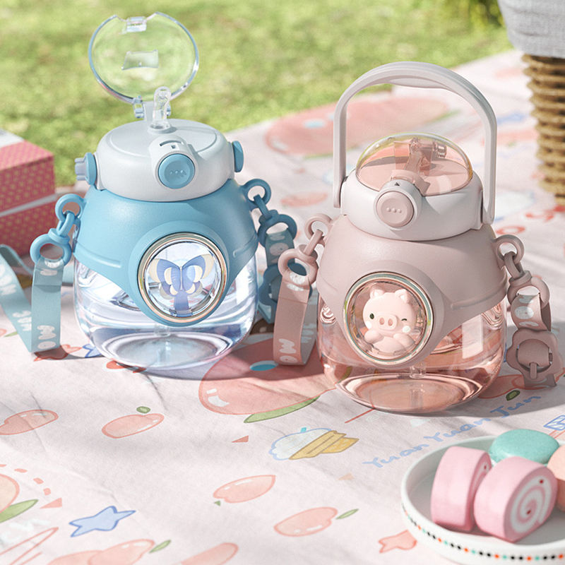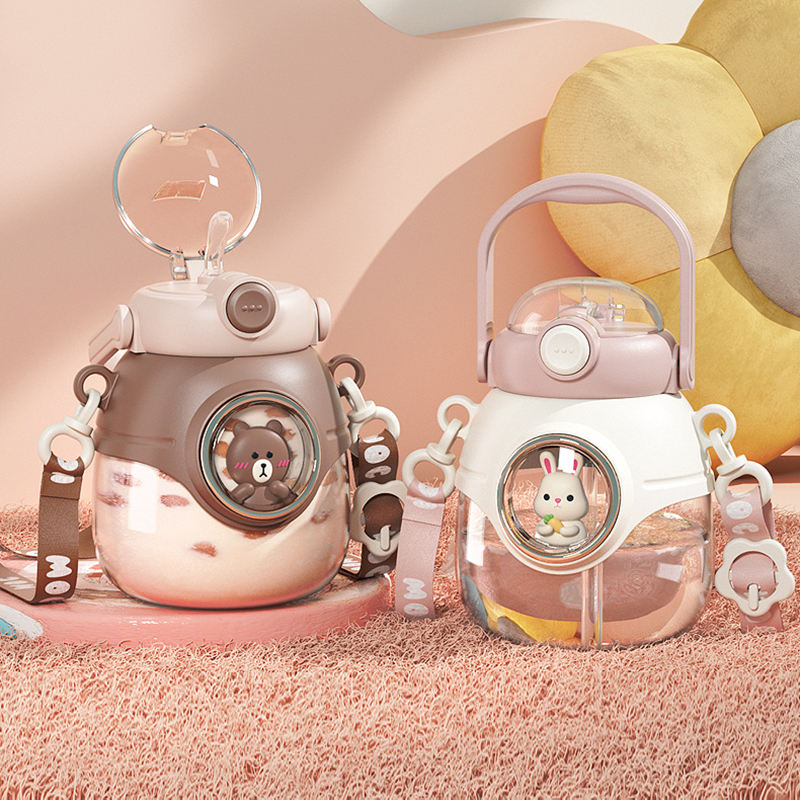 ถ้วยน้ำพลาสติกสำหรับเด็กถ้วยท้องใบใหญ่ลายการ์ตูนงารูปสัตว์ขวดพกพาแบบป๊อปอัพคลิกเดียว