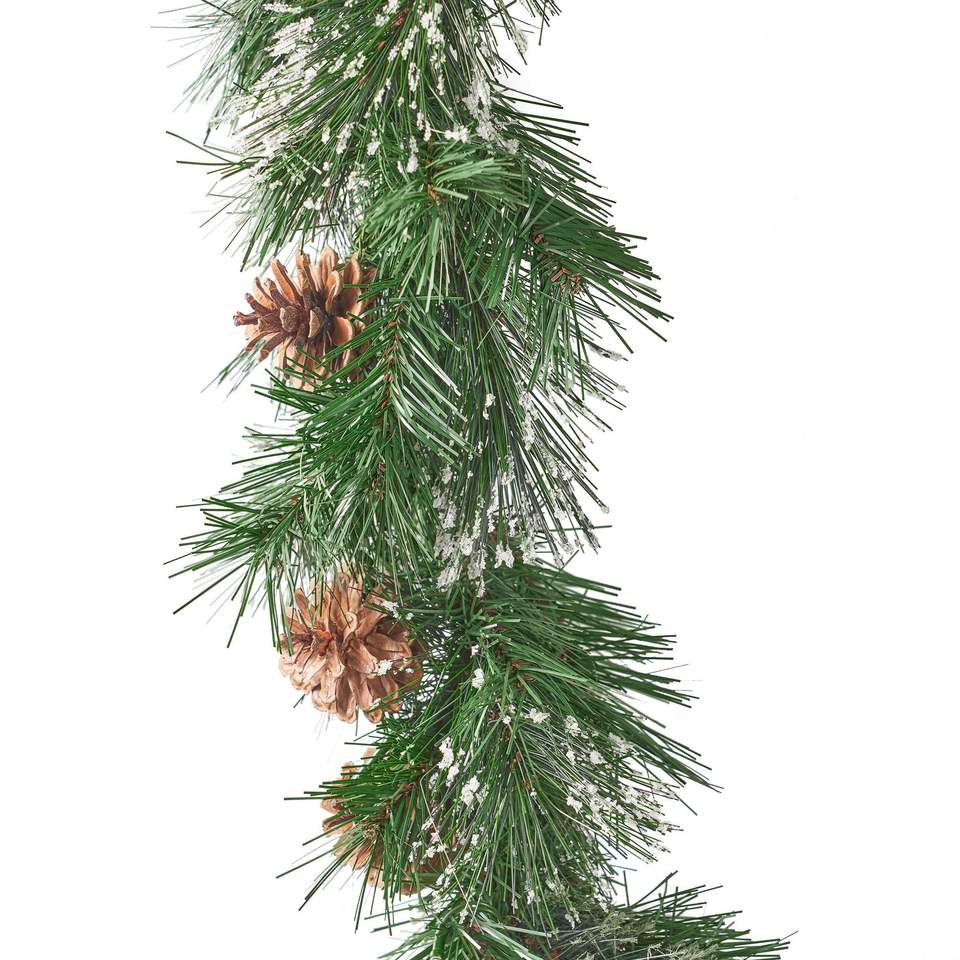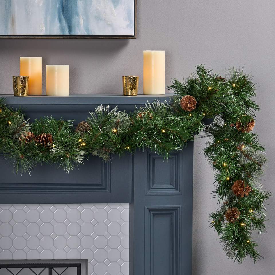 ชุดพวงมาลัยคริสต์มาสขนาด 9 ฟุต 2 ชิ้น พร้อมลูกสน 20 ลูก ไฟ LED สีขาวอบอุ่น 50 ดวง ใช้แบตเตอรี่ พร้อมตัวตั้งเวลา ขนแปรงสีน้ำเงินขาวเหมือนหิมะ สำหรับตกแต่งภายใน