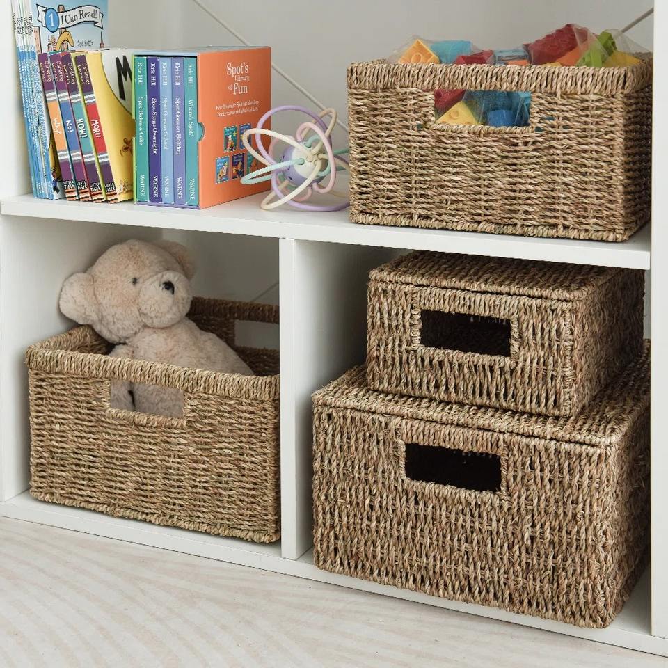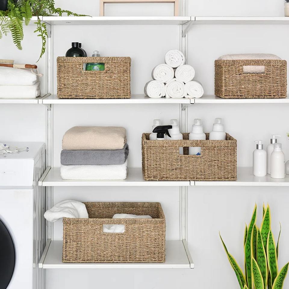 ตะกร้าเก็บของหวายทะเล 2 ใบ พร้อมหูหิ้วในตัว ตะกร้าเก็บของทำมือ ขายส่ง เป็นมิตรกับสิ่งแวดล้อม ผลิตในเวียดนาม