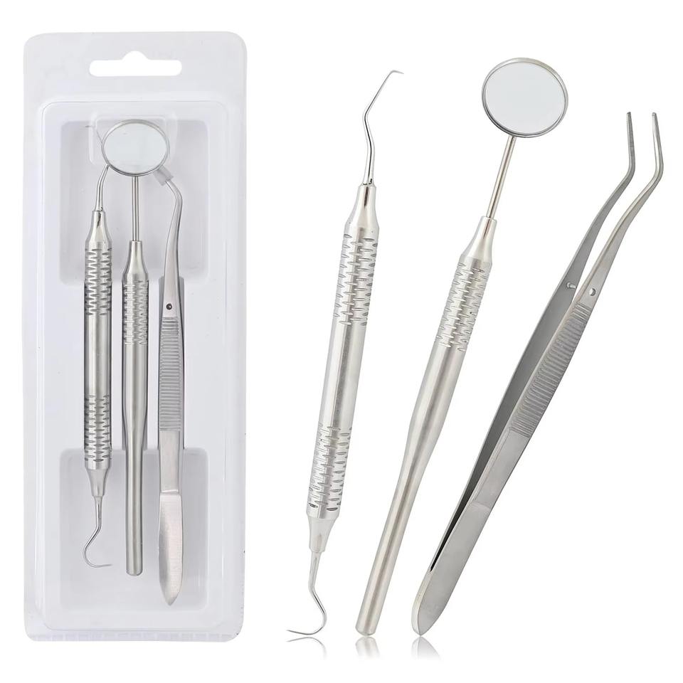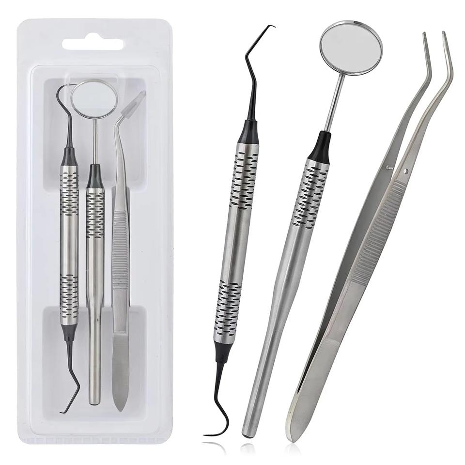ชุดเครื่องมือทันตกรรมสแตนเลสแบบแมนนวล 3 ชิ้น ประกอบด้วยกระจกตรวจฟัน คีมถอนฟัน และคีมตัดไหมขัดฟัน | ชุดอุปกรณ์ตรวจสุขภาพช่องปากแบบ Ergonomic Grip Class I