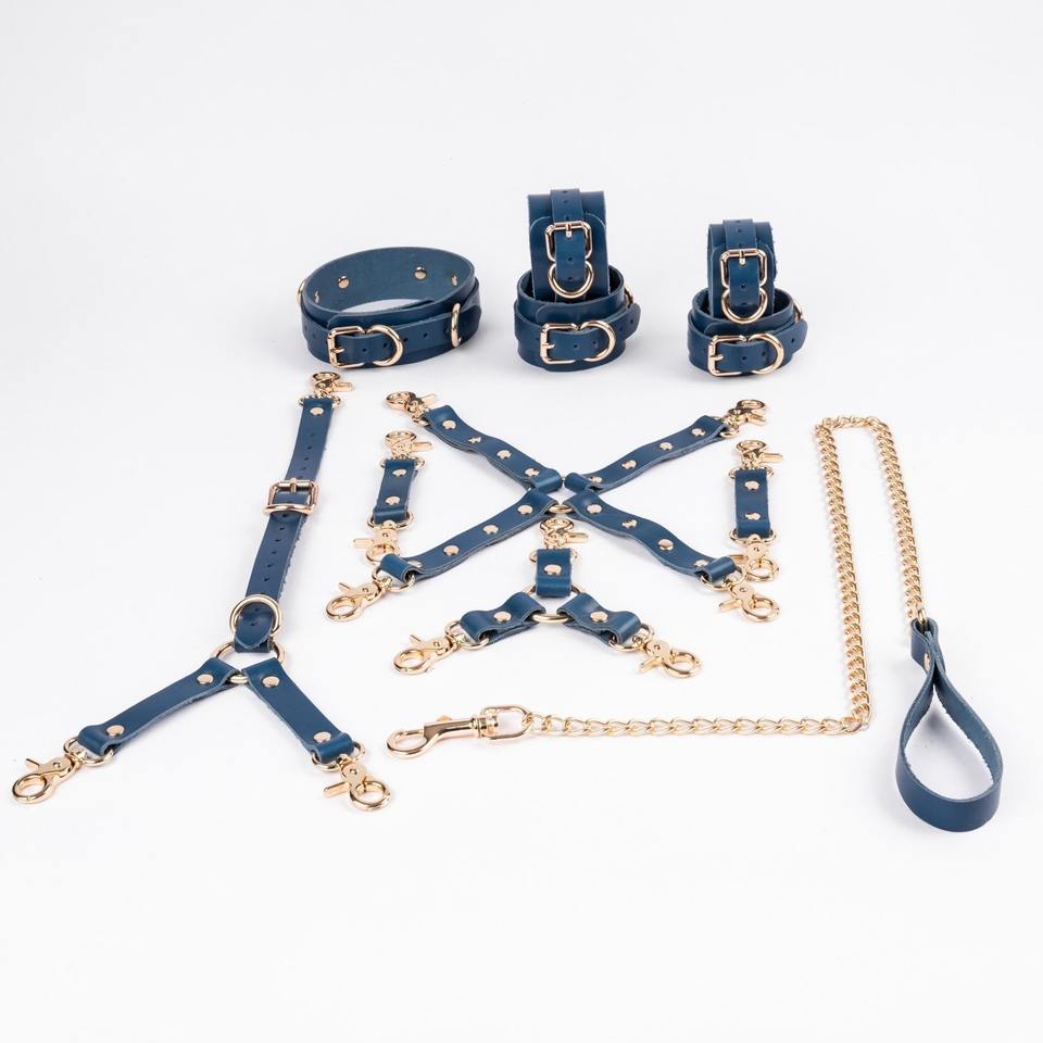 ชุดหนัง Cowhide ข้อมือข้อเท้าข้อมือคอปกกลับเข็มขัดและสายจูง 2 สาม 4 ทาง 11 ชิ้นชุด BDSM-0025