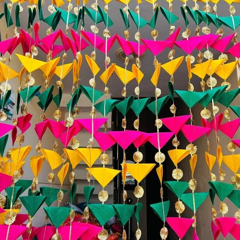 Set of 10 Classic Traditional Fabric Gota Triangle String Colorful Wall Hanging Party Backdrop Decoration for Holi