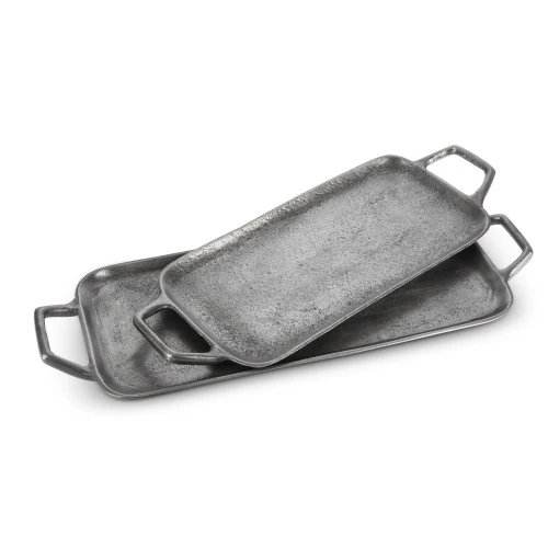ถาดอลูมิเนียม2ชุดพร้อมที่จับถาดเสิร์ฟอาหารตั้งโต๊ะสีเงินรูปทรงกำหนดได้เองใช้ในโรงแรมและงานแต่งงาน