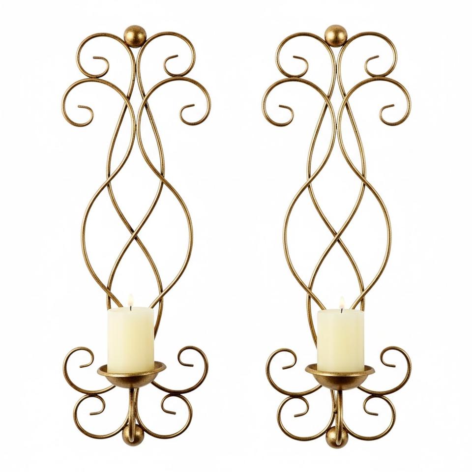 Set Of 2 Antique Gold Metal Wall Sconces Candle Holders Scroll Design Wall Mounted Decoration For Living Room Dining Room Decor
