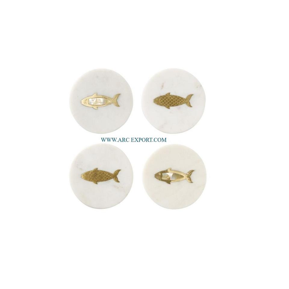 ชุดที่รองแก้วกาแฟและชาหินอ่อนสีขาวขัดเงาสีทองดีไซน์เนอร์ปลา2ชิ้น