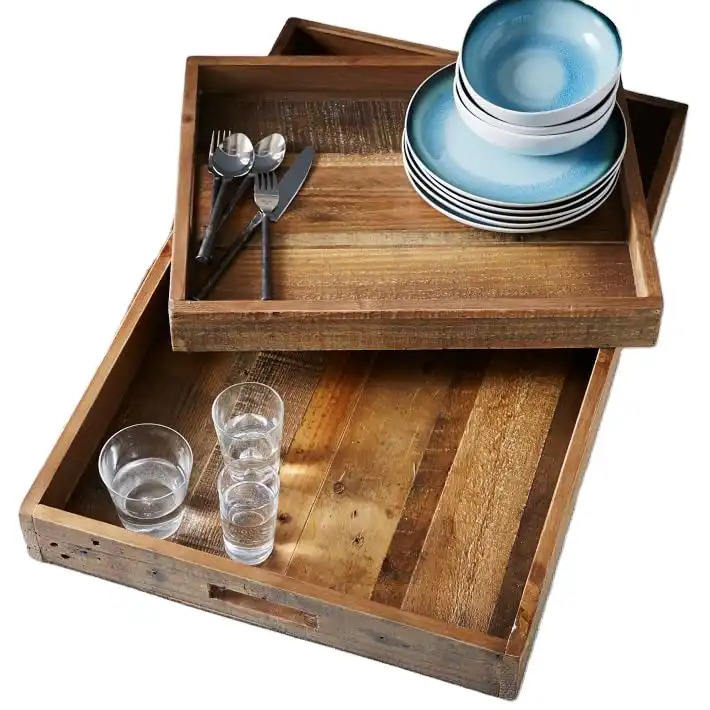 ชุดถาดเสิร์ฟอาหารไม้ธรรมชาติ2ชิ้นพร้อมที่จับเชือกถาดเสิร์ฟอาหารบนโต๊ะเครื่องครัวในบ้านและโรงแรม