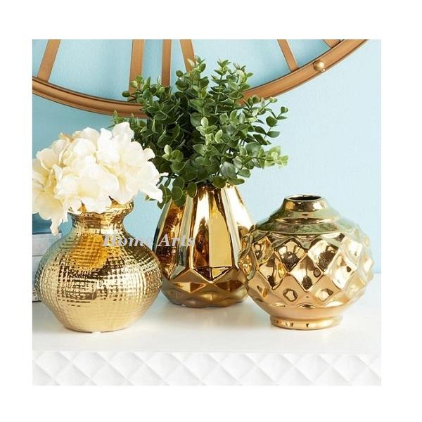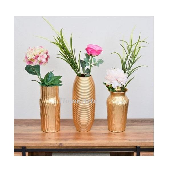 ชุดแจกันดอกไม้ 3 ใบ ขนาดและรูปทรงต่างกัน ดีไซน์โบราณ ทำจากอะลูมิเนียม สีทอง ราคาไม่แพง