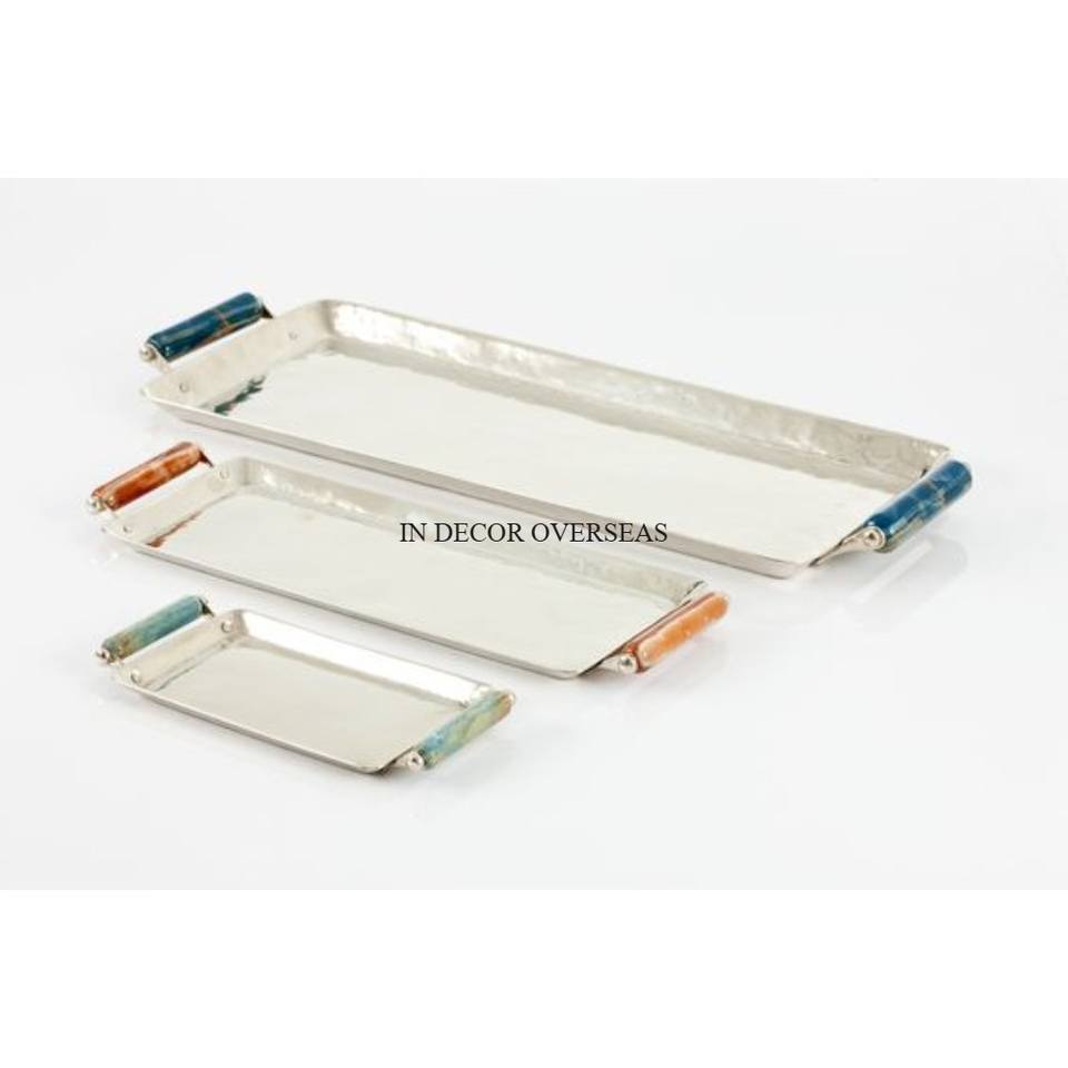 ชุด3สีเงินมันเงาสำหรับงานหนักถาดเสิร์ฟทรงสี่เหลี่ยมผืนผ้าพร้อมอุปกรณ์จับสีที่เป็นเอกลักษณ์