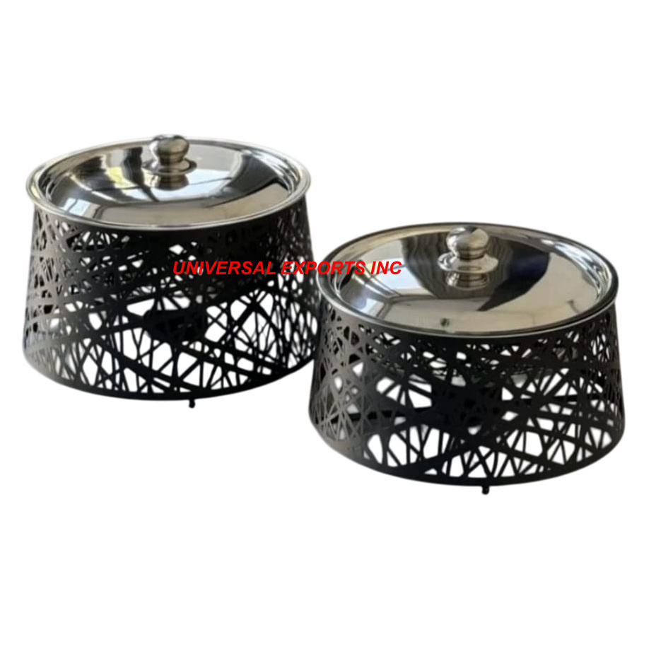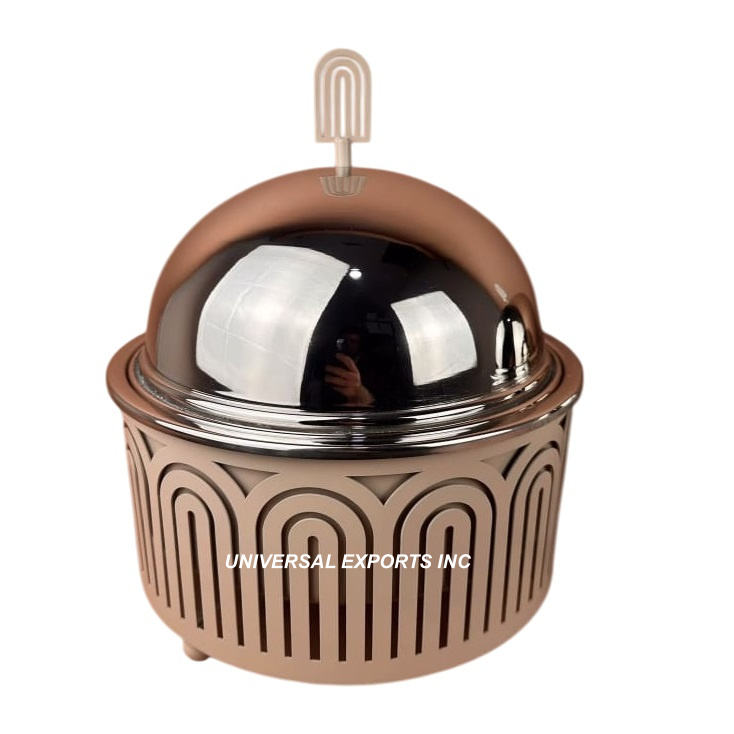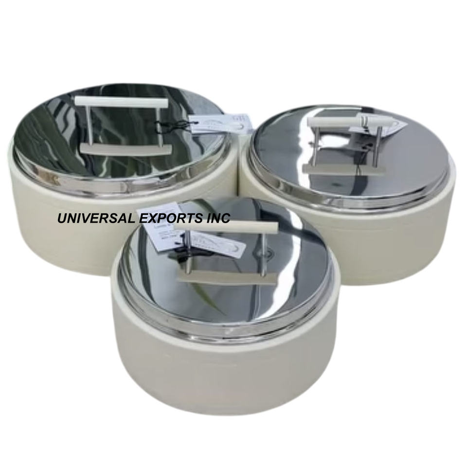 ชุดหม้ออุ่นอาหารสแตนเลสสุดหรูหม้ออุ่นอาหารเคลือบเงาสามชิ้นดีไซน์เนอร์ทรงกลม