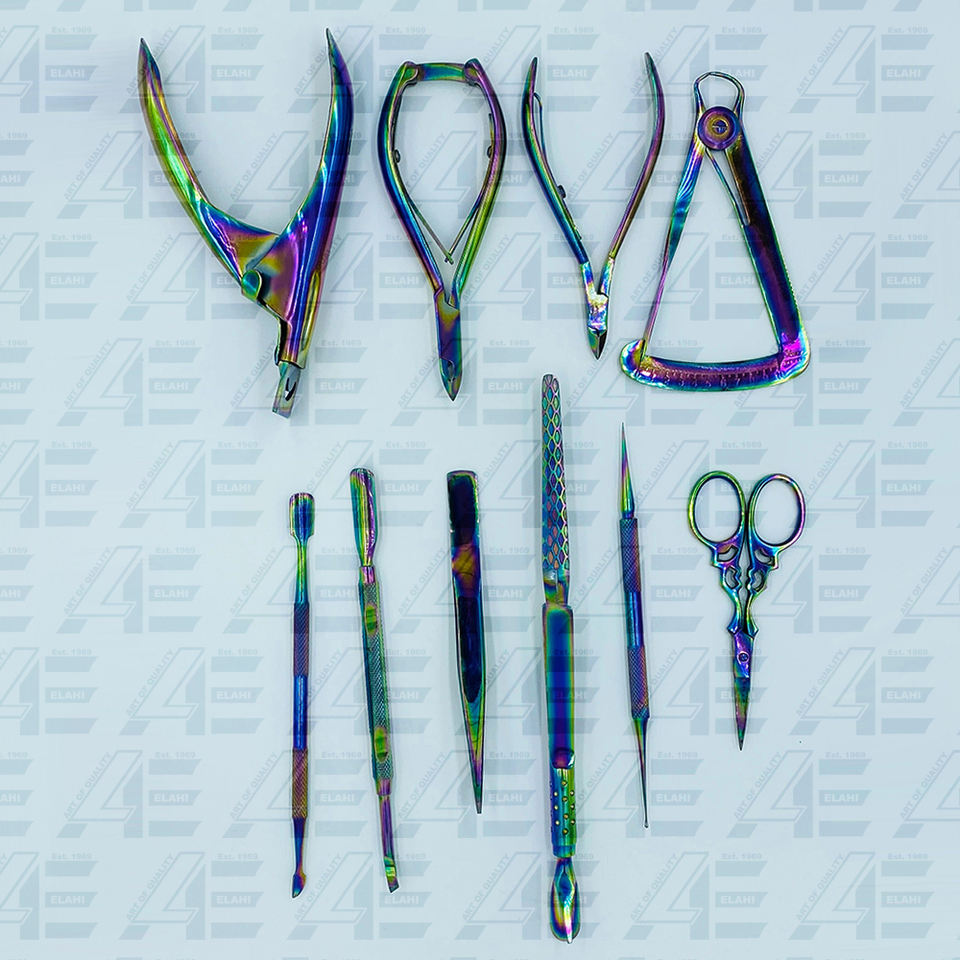 ชุดอุปกรณ์ทำเล็บมืออาชีพ 10 ชิ้น สแตนเลสสตีลสีรุ้ง คีมตัดหนังกำพร้าแบบสองด้าน กรรไกรตัดเล็บ คุณภาพสูง