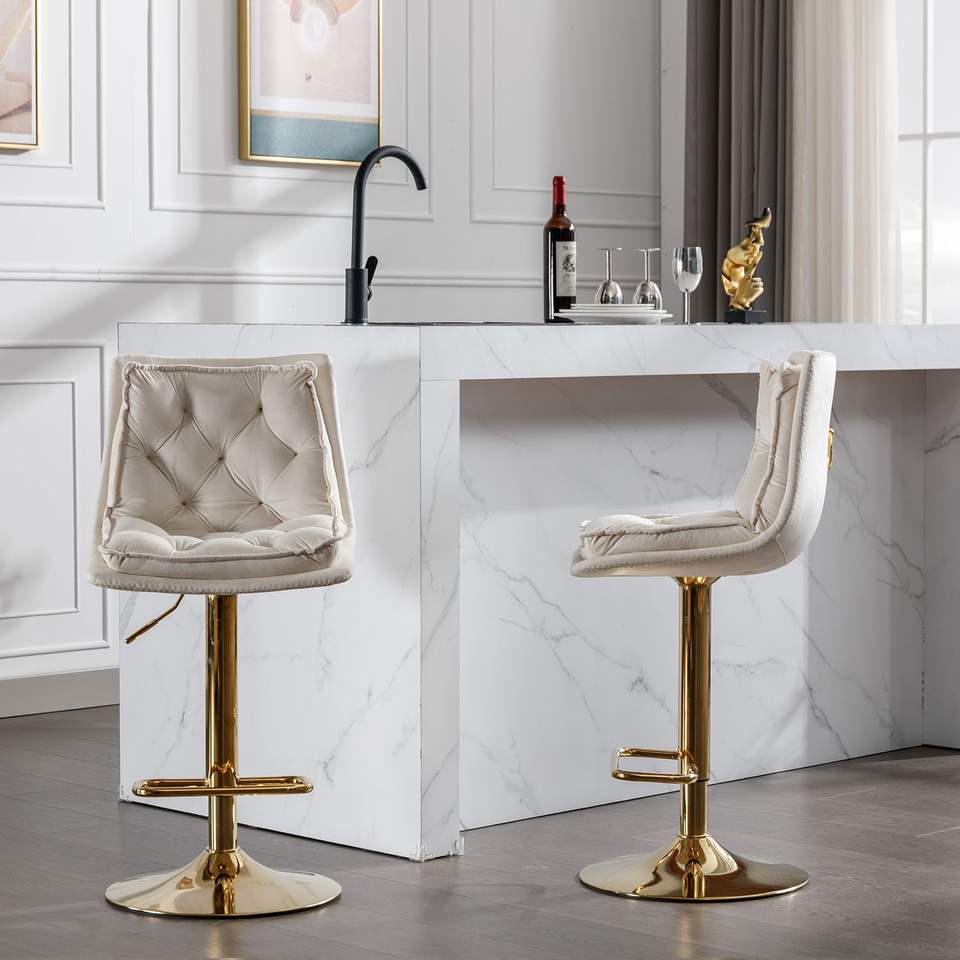 ชุดเก้าอี้บาร์ผ้ากำมะหยี่สีครีม2ชิ้นพร้อมที่วางเท้าโครเมี่ยมเรียบง่ายขาสีทองปรับความสูงได้ออกแบบให้หมุนได้ด้วยกลไก