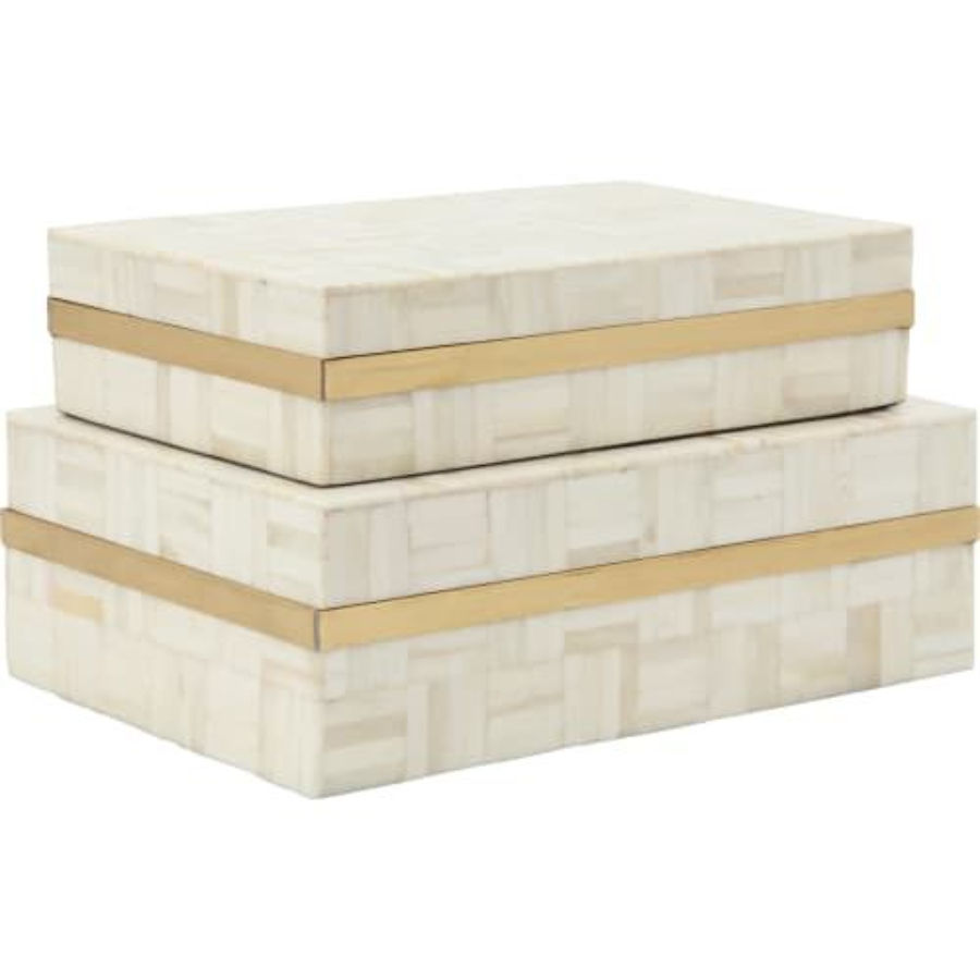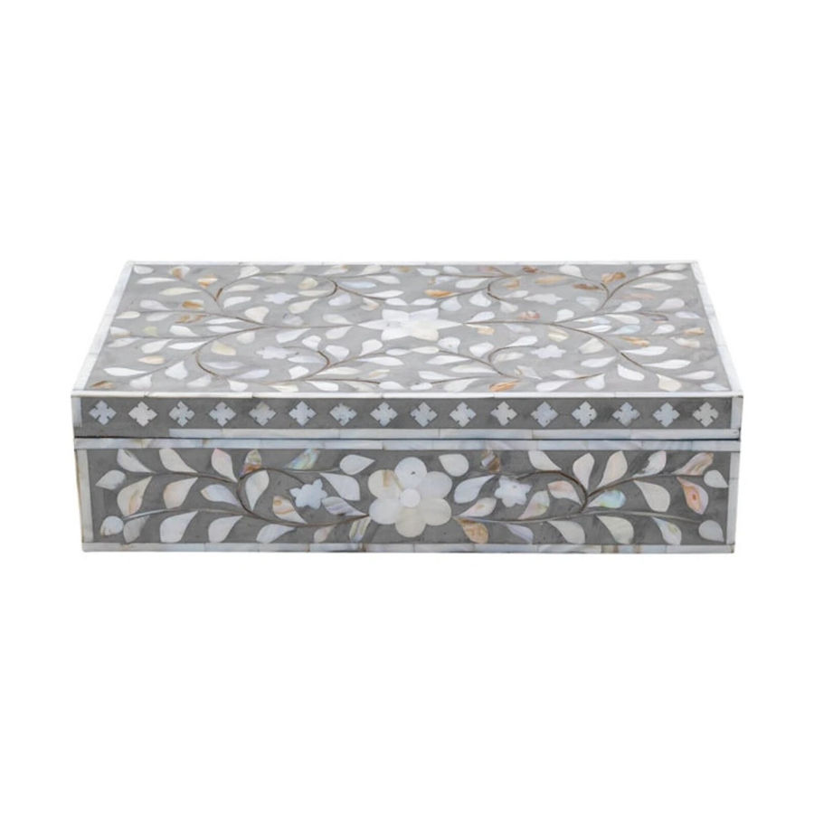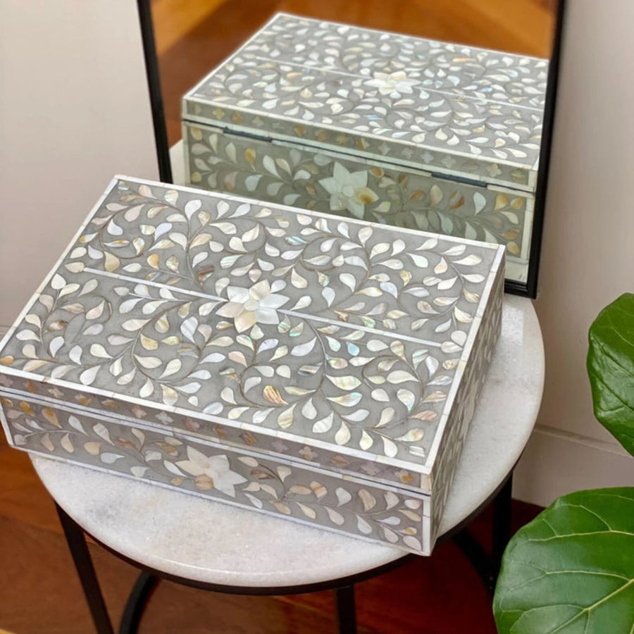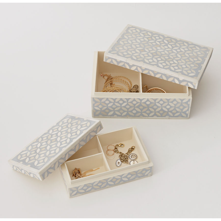 ชุดกล่องเก็บเครื่องประดับมุก2ชิ้นขนาดแตกต่างกันกล่องแสดงเครื่องประดับแบบฝังสีขาวและเทาจากอินเดีย