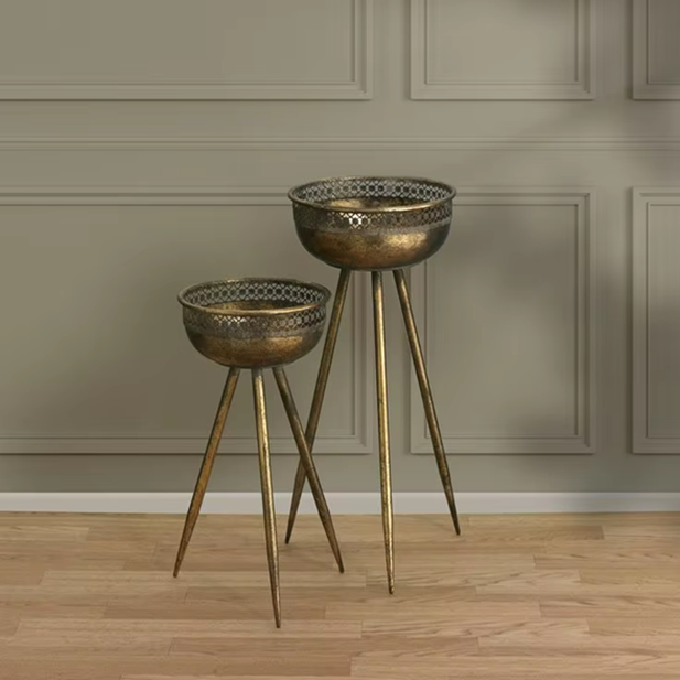 ชุดกระถางต้นไม้ 2 ชิ้น ดีไซน์ทันสมัยทรงกลมเคลือบทอง ผลิตจากโลหะ สำหรับใช้ในสวน