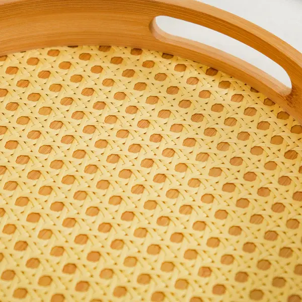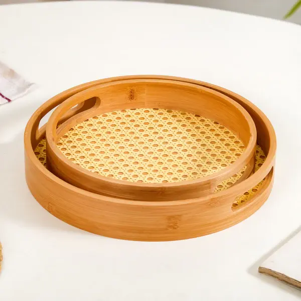 ชุดถาดไม้กลมสานหวาย2ชุดจะแสดงในภาพถาดทำจากไม้สีอ่อนที่มีหวายทอ