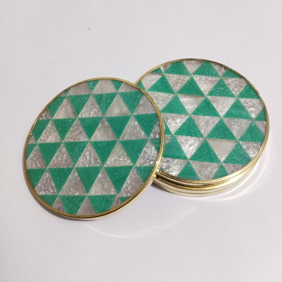 ชุดจานรองแก้วเรซิ่นลายมุกสีเขียวรูปสามเหลี่ยม งานแฮนด์เมดรักษ์โลก ของตกแต่งโต๊ะ หนา 5 มม. ขอบสีทอง ผลิตในอินเดีย