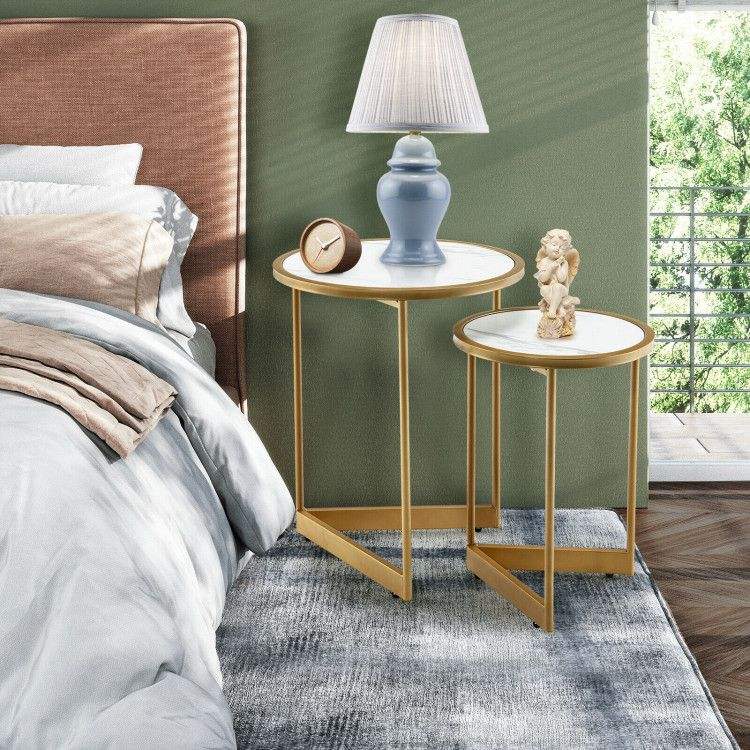 ชุดโต๊ะกาแฟทรงกลม 2 ตัว แบบซ้อนกันได้ หน้าโต๊ะลายหินอ่อน สำหรับห้องนั่งเล่น