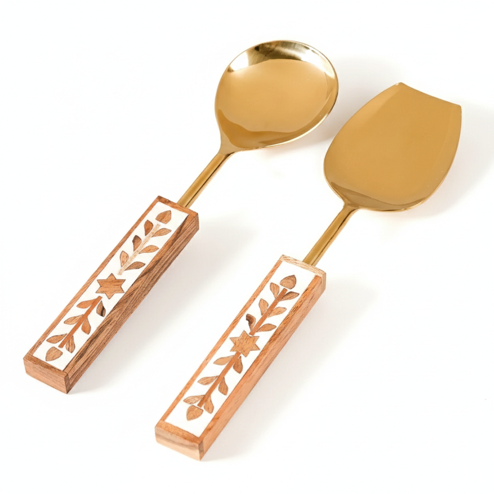 Set of 2 Serving Spoons with Wood Inlay Handles – Stainless Steel Gold Serving Utensils Luxury Kitchen & Table Decor Wholesale