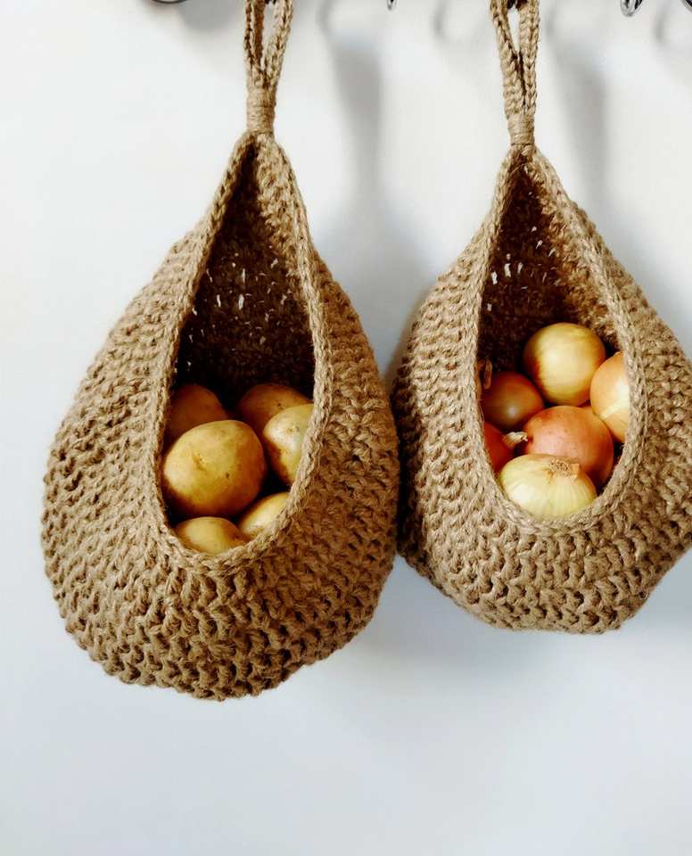 ชุดตะกร้าแขวนผลไม้และผักทรงหยดน้ำ ทำจากปอกระเจา 2 ใบ สำหรับเก็บกระเทียมและหัวหอม