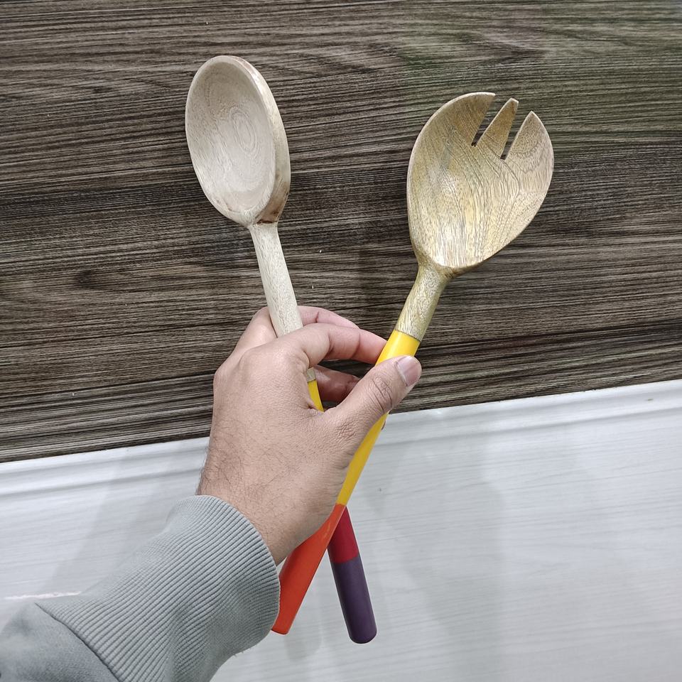 ชุดอุปกรณ์ครัวไม้ 2 ชิ้น พร้อมด้ามจับหลากสีสัน ช้อนและสปอร์คทำมือ สำหรับทำอาหาร เสิร์ฟ และตกแต่งโต๊ะอาหารสไตล์เรียบง่าย