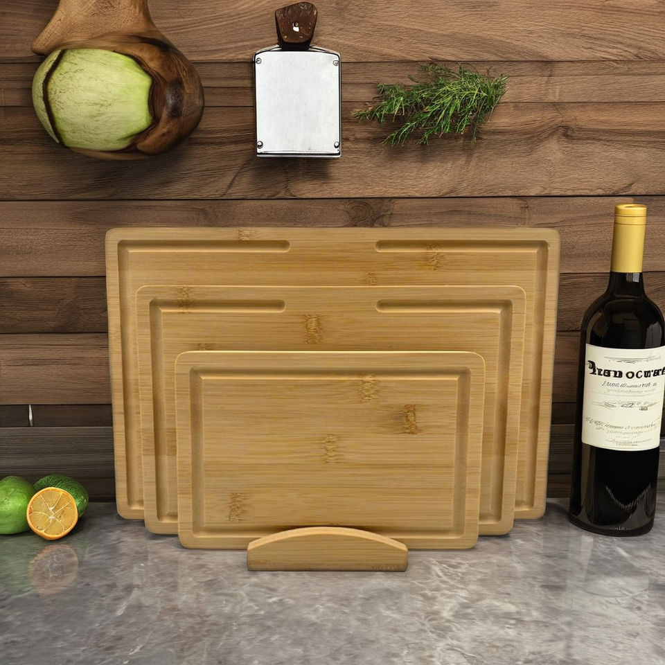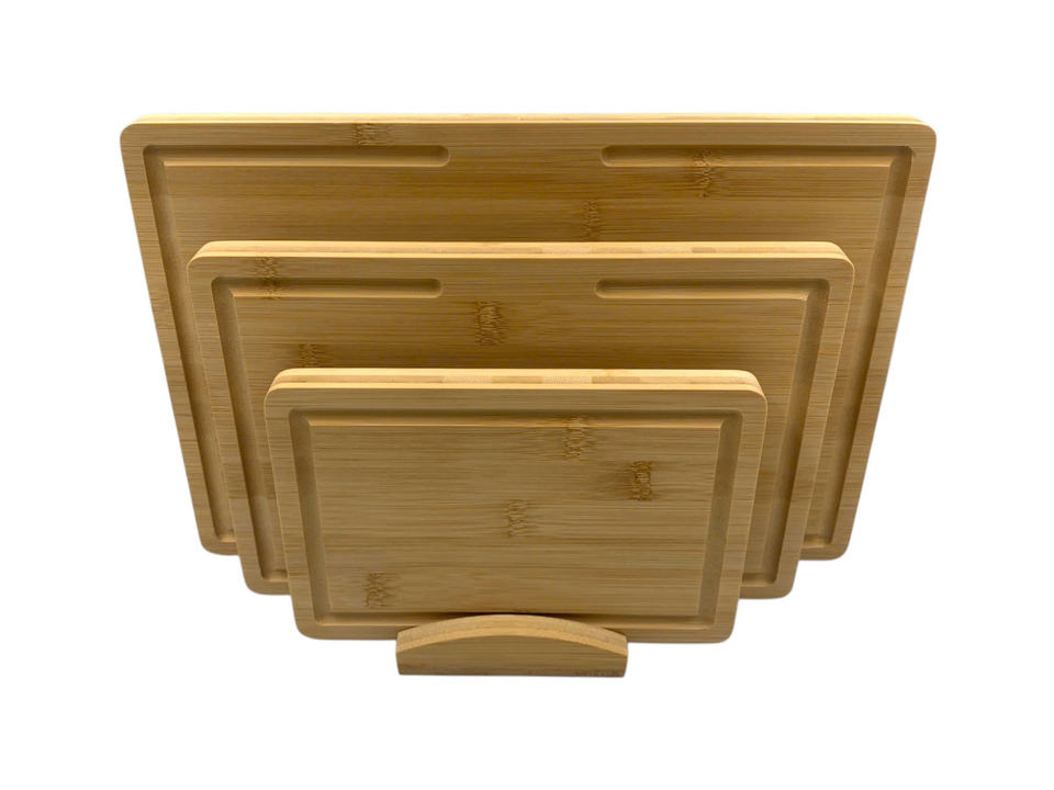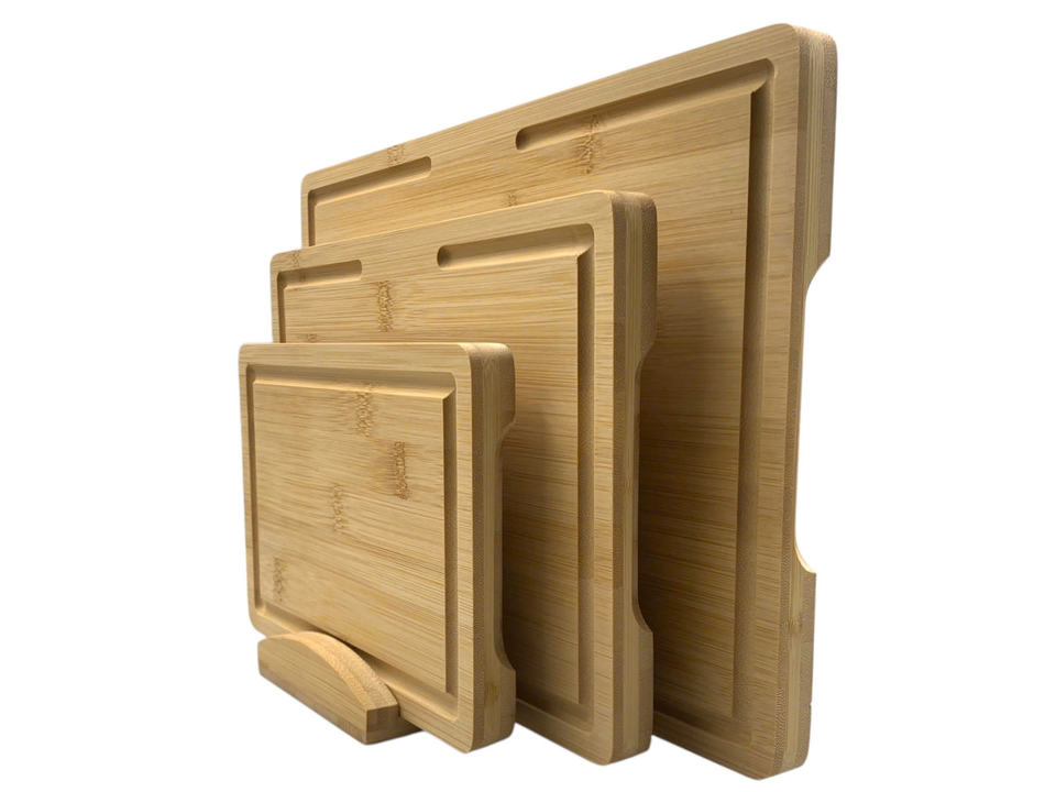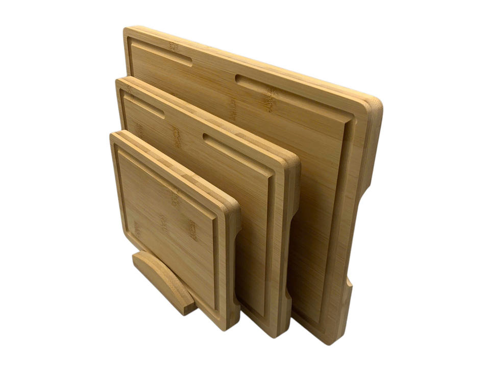 ชุดเขียงไม้ไผ่ขนาดใหญ่ 3 ชิ้น ขนาด SML พร้อมที่จับไม้ไผ่และกล่อง บรรจุภัณฑ์ทนทาน ปลอดสารพิษ ใช้กับเครื่องล้างจานได้ ผลิตในเวียดนาม