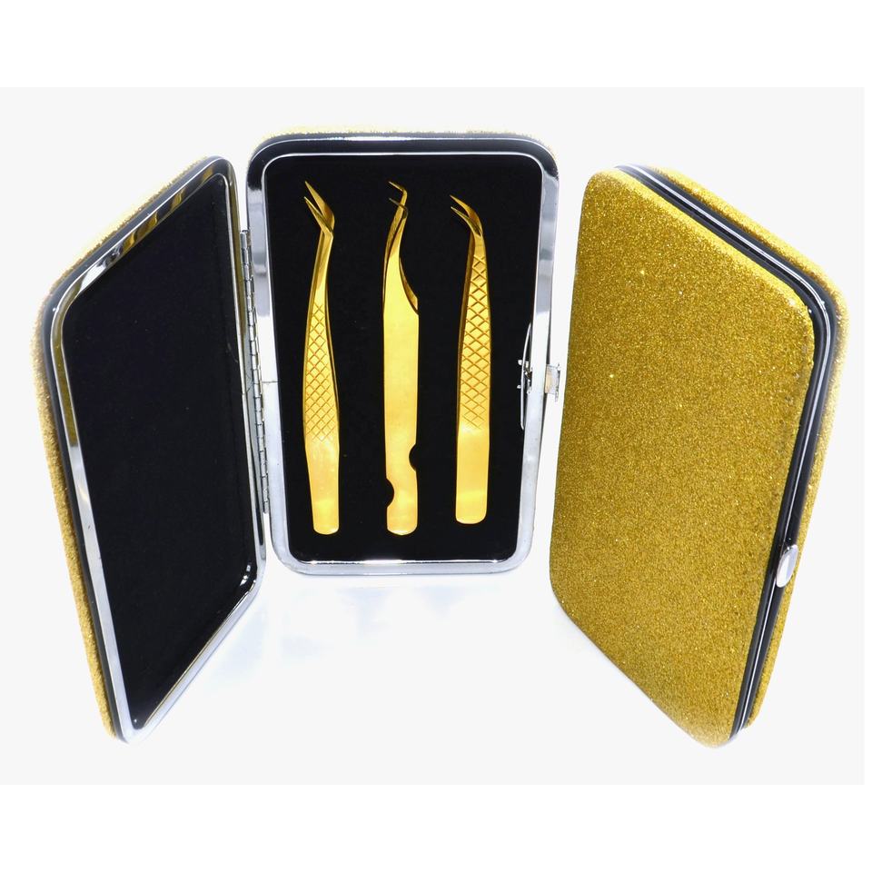 Set of 3 Gold Eyelash Extension Tweezers 45 Degree Curved Magnetic Stainless Steel Box Fan Pickup with Isolation Fiber Tips