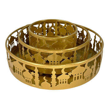 ชุดถาดอลูมิเนียมสีทองรอบเดือนรอมฎอน3ชุดพร้อมดีไซน์แบบกลวงเหมาะสำหรับงานปาร์ตี้และของขวัญสุดหรูบนโต๊ะอาหาร
