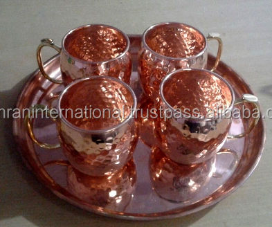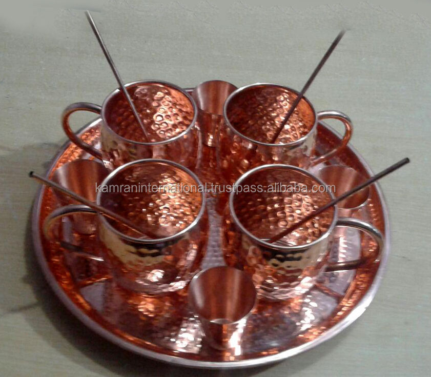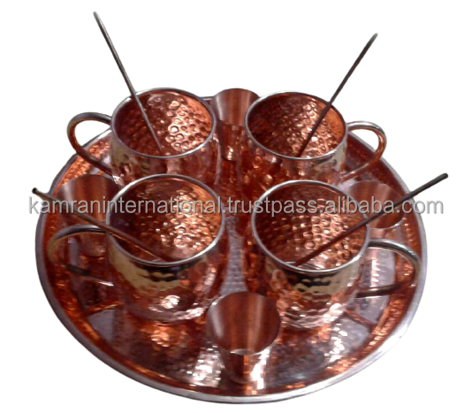 ชุดภาชนะใส่เครื่องดื่มมอสโกมิวล์เป็นมิตรต่อสิ่งแวดล้อม4ชิ้นพร้อมหลอดดูดทำจากทองแดงพร้อมถาดเสิร์ฟ