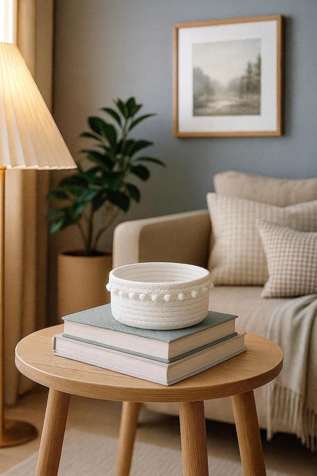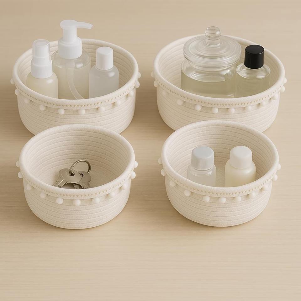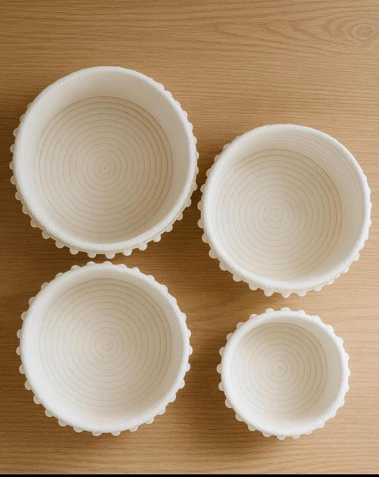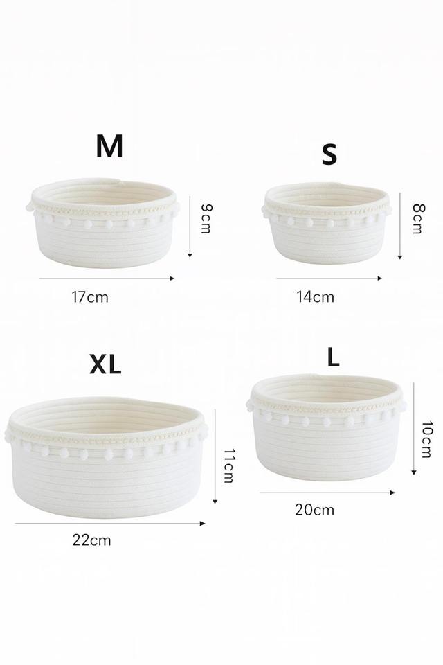 ชุดตะกร้าแมคคราเม่สีขาว4ใบอุปกรณ์จัดระเบียบของตกแต่งบ้านห้องนอนห้องนั่งเล่นและห้องเด็กเล่นจากอินเดีย