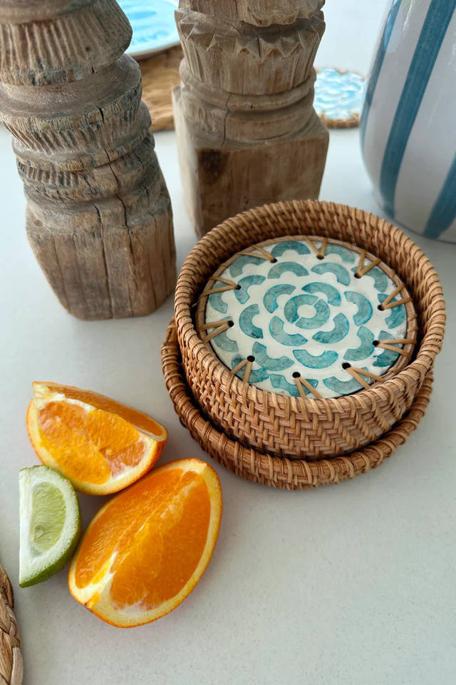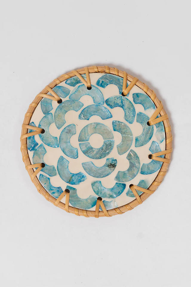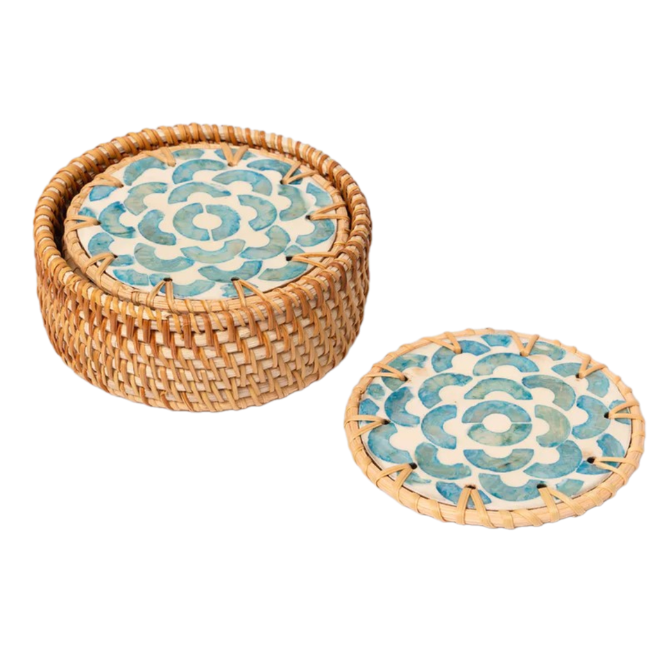 ชุด 4 ชิ้นและผู้ถือ หวายทอมือและแม่มุกฝังจานรองแก้ว หวายทรงกลมสําหรับเครื่องดื่ม
