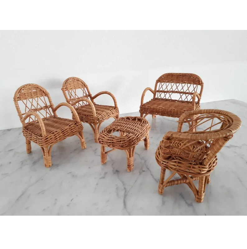 ชุดเฟอร์นิเจอร์บ้านตุ๊กตาหวายสไตล์วินเทจขนาดเล็ก5ชิ้นสำหรับเด็กโมเดลของเล่นพลาสติกการ์ตูนน่ารักสำหรับใช้ตกแต่ง