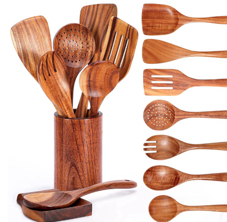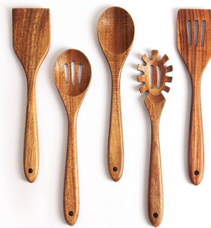 ชุดช้อนทำอาหารไม้เนื้อแข็งธรรมชาติ 5 ชิ้น (ปลอดภัยสำหรับการใช้งานแบบไม่ติดกระทะ)