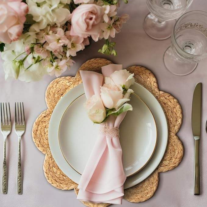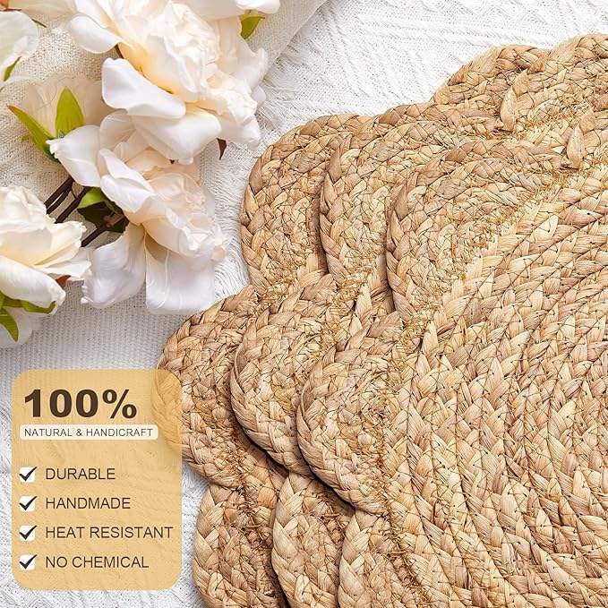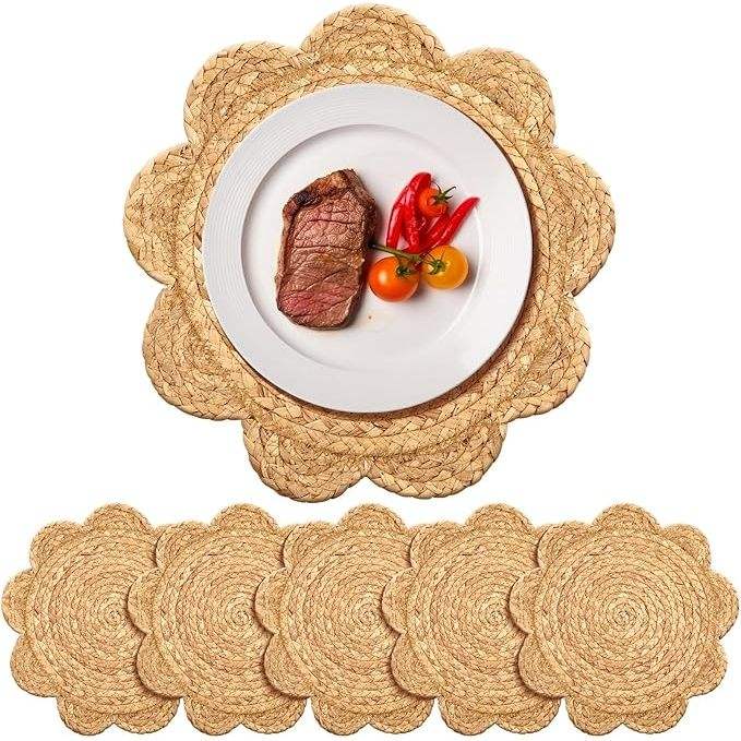 แผ่นรองจานหวายสานทรงกลม6ชิ้น13.8แผ่นรองโต๊ะสไตล์โบโฮขอบหอยพัดสำหรับตกแต่งห้องรับประทานอาหาร