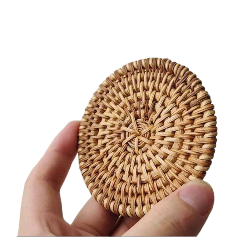ชุดที่รองแก้วหวายทรงกลมทำด้วยมือ6ชิ้นพร้อมถาดรองแก้วหวายทรงกลมทำด้วยมือมีสไตล์จากเวียดนาม