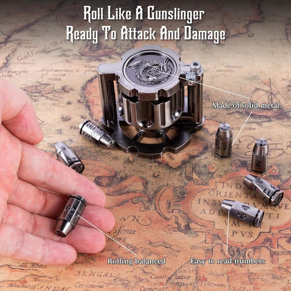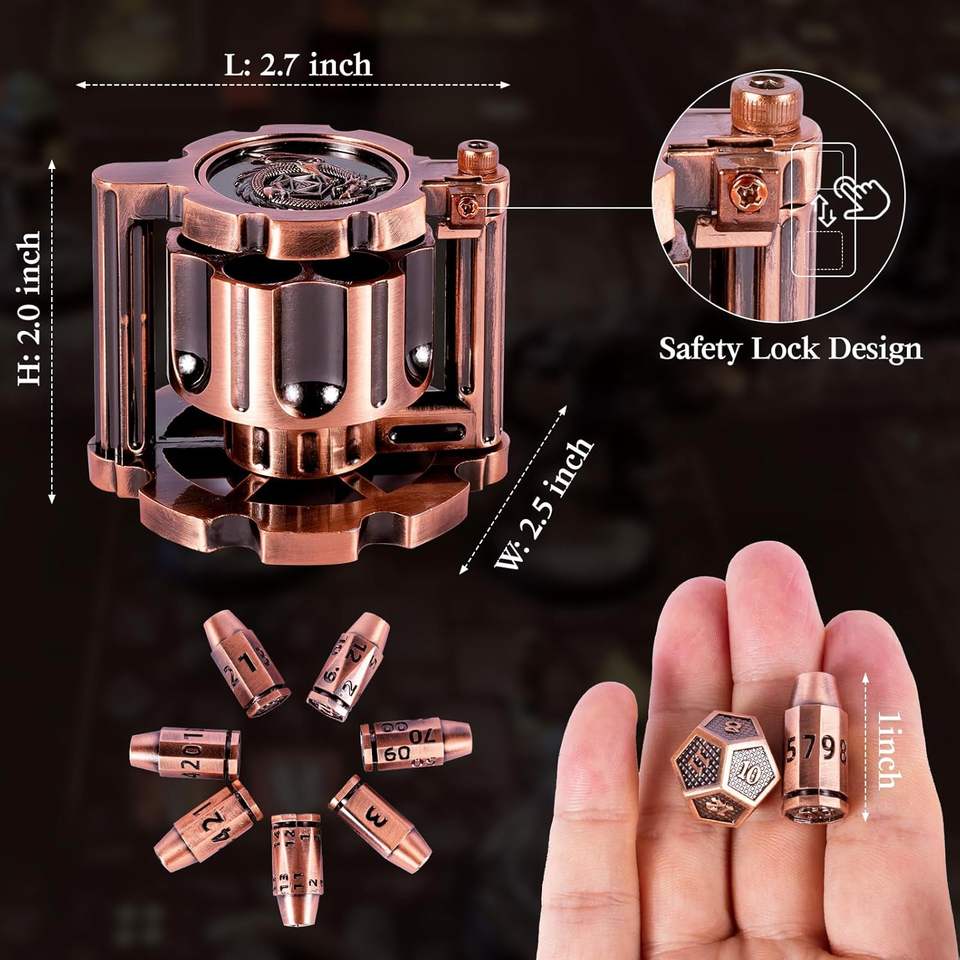 ชุดกล่องทรงกระบอกรีโวลเวอร์ลูกเต๋าทรงกระสุนหลายเหลี่ยมทำจากโลหะ7ชิ้นสำหรับเกมบนโต๊ะธีมอาชญากรรม D & D & Sci-Fi