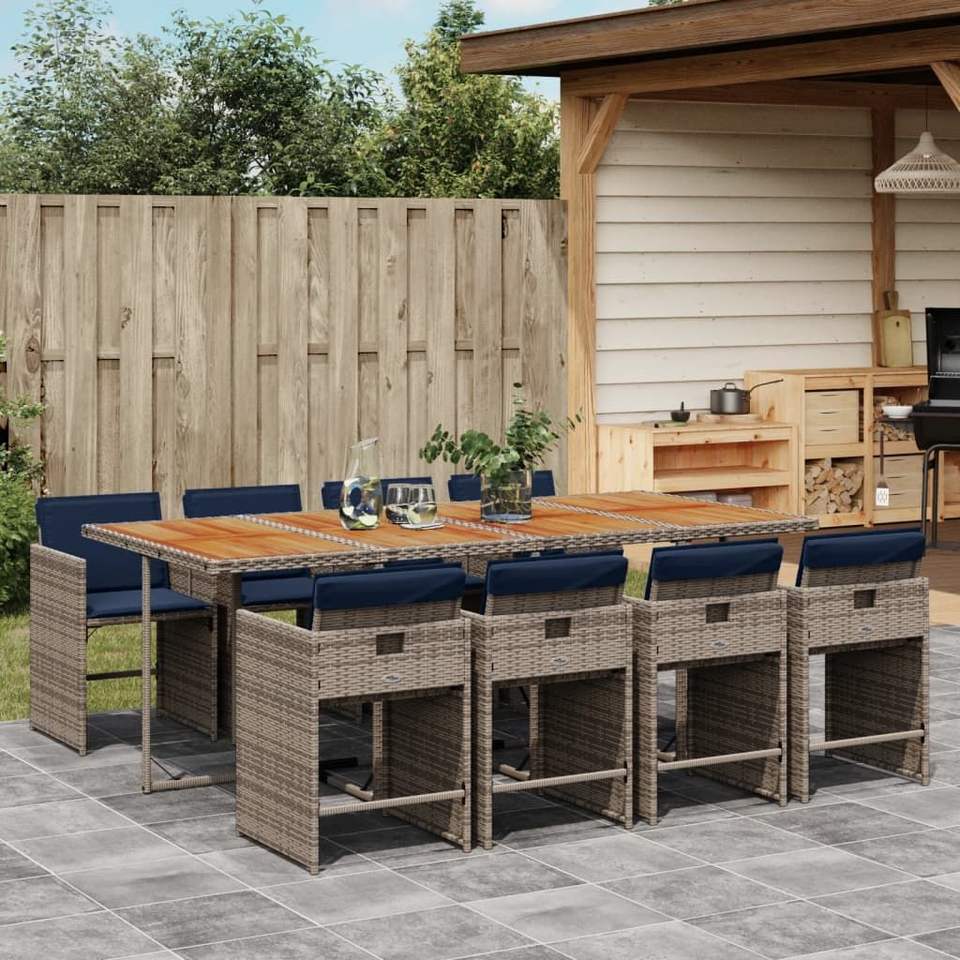 ชุดโต๊ะรับประทานอาหารในสวนสีเทาและสีน้ำตาล 8 ชิ้น พร้อมเบาะรองนั่งสีกรมท่า