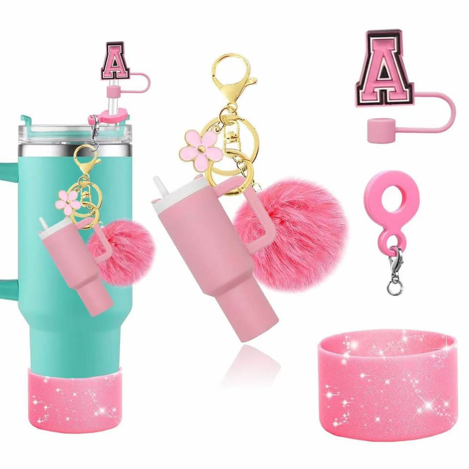 ชุดพวงกุญแจลูกบอลขนฟู 4 ชิ้น แก้วอะคริลิคขนาดเล็กพร้อมหลอดและจุกปิดกันฝุ่น ดีไซน์แก้วเก๋ไก๋