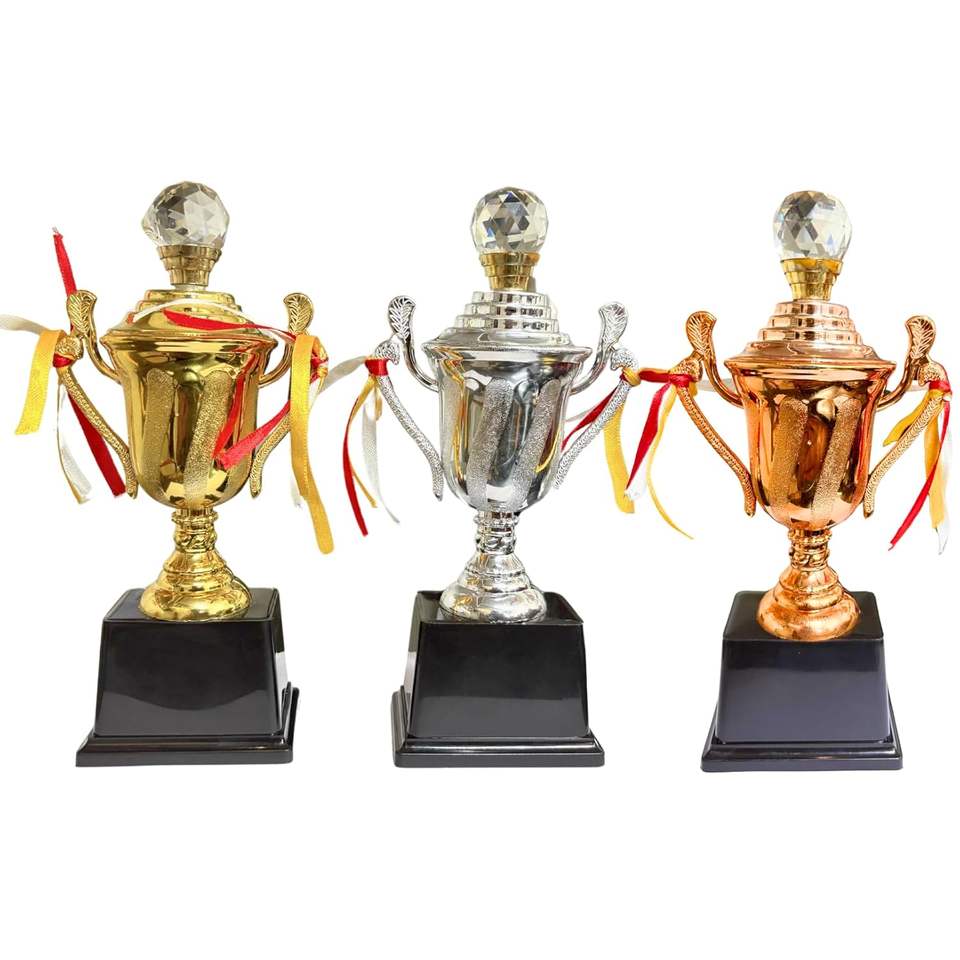 ชุดถ้วยรางวัลโลหะสีทอง เงิน และทองแดง พร้อมโลโก้คริสตัลส่องประกาย พิมพ์ข้อความและปรับแต่งได้ตามต้องการ